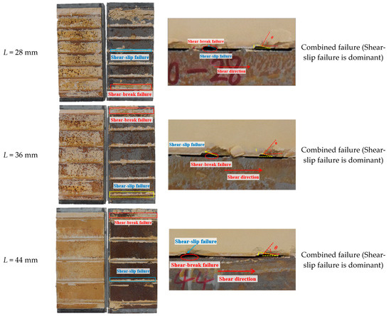 When L is 12 mm, i is about 17° (which finally produces a nearly horizontal macroscopic rupture band), and θ is about 25°. Most of the gaps between the ribs have been filled with worn or sheared gypsum debris, in which the narrower and lighter color debris band near the root of the ribs is debris generated by the shear-slip failure, while the wider and yellowish debris band between the two ribs is debris generated by the shear-break failure. There is a certain gap between the upper and lower specimens, and the gypsum near the ribs of the upper specimen is not all sheared, which indicates that shear-slip failure was generated. Therefore, the interface failure mode is a combined failure, but mainly shear-break failure.
