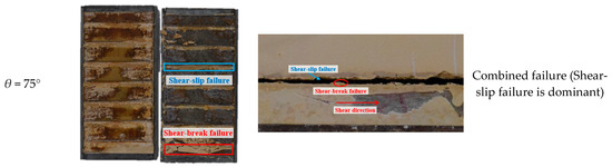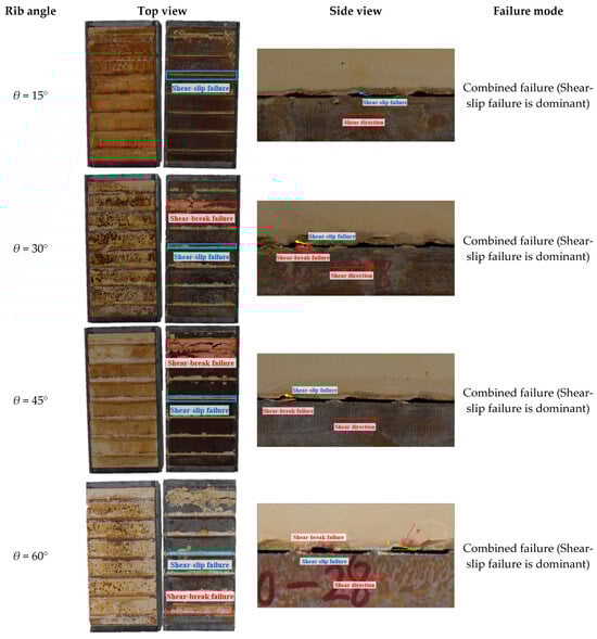 When the rib angle is 45°, 60° and 75°, the interface failure morphology is similar to that of the interface failure morphology when the rib angle is 30°. Also, the failure modes are all combined failure, and the shear-slip damages are dominant; however, due to the difference of the rib angle, the proportion of shear-break failure has changed.