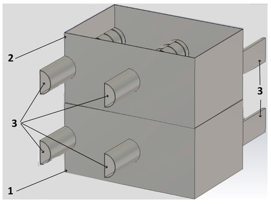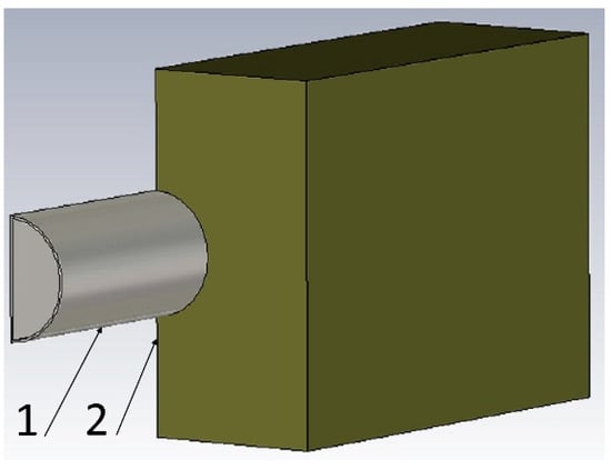 The studies were performed by the computer-assisted modeling of the distribution of the microwave electromagnetic field emitted from a semicircular waveguide with slot radiators into a grain layer (see Figure 2). To achieve this purpose, the software package CST Studio Suite 2022.05 SP5 [,,] was applied. The inner diameter of the semicircular waveguide was 50 mm.