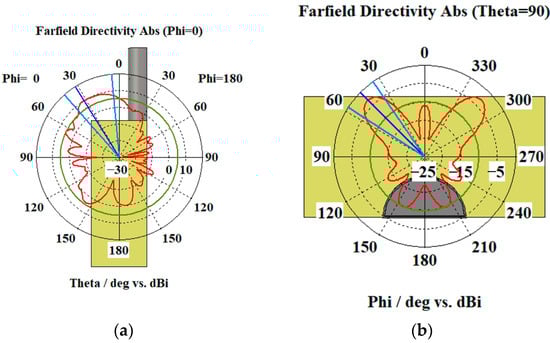 Directional diagrams obtained by modelling, for microwave field emitted from the waveguide’s slots: (a) directional diagram of radiation, for Phi = 0°; (b) directional diagram of radiation, for Theta = 90°.