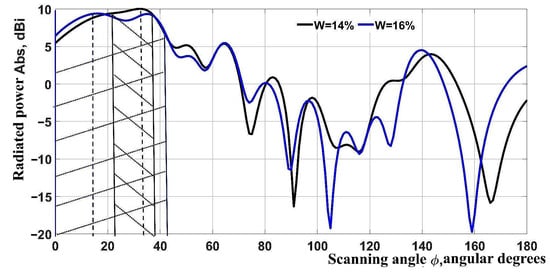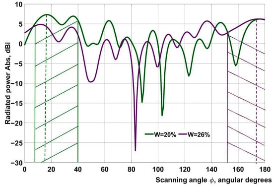 For ease of analysis, radiation directional diagrams for Phi = 0° are presented in linear form (Figure 4 and Figure 5). This directional diagram is shown in the angle range from 0° to 180°. It presents the distribution of the microwave field emitted from the slot radiators directly into a grain layer. In the case of linear representation, the entire waveguide length is divided into 180°. For a 400 mm long waveguide, one angular degree corresponds to 2.2 mm.