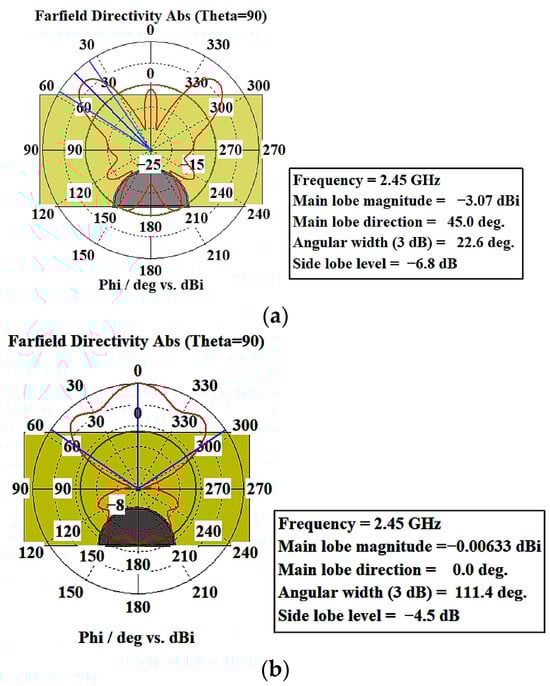 Radiation directional diagrams of microwave field, for angle Theta = 90°: (a) microwave radiation directivity in a grain layer having moisture content of 14%; (b) microwave radiation directivity in a grain layer having moisture content 26%.