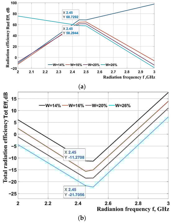 Dependence of the waveguide’s radiation efficiency on the moisture content in grain: (a) radiation efficiency; (b) total efficiency.