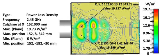 The depth of the grain layer was assumed to be 100 mm from the waveguide’s walls. Therefore, the size of the grain layer was 254 mm vertically and 152 mm horizontally. Modelling was carried out without a metal casing of the microwave-active zone.
