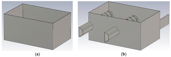 Simulations were performed to determine the Q-factor using the software package CST Microwave Studio 2019 in order to ascertain how and to what extent waveguides in the microwave active zone affect the Q-factor. Two configurations of the microwave-active zone casing were studied, i.e., with (Figure 9b) and without waveguides (Figure 9a).