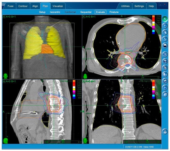 Symptoms relief can be achieved with conventional fractionated conformal external beam radiotherapy (cEBRT) because it is convenient and cost-effective. Nevertheless, given the longer survival of patients with metastatic cancer, we should try more radical treatments due to the improvements that are evident in systemic therapies, such as targeted therapies and immunotherapies. In addition, the low radiation tolerance of the spinal cord and cauda equine requires optimal radiation dose delivery for durable tumor control [2]. However, since the treatment dose is limited by organs at risk (OARs), it is not possible to reach ablative doses within the tumor volume with cEBRT. Complete response rates of 17–34% and partial responses of 49% have been described with cEBRT, with an overall response rate of 60–66%. In addition, it has been reported that a retreatment incidence between 7.4 and 21.5% can be seen, depending on the fractionation schedule [10,11].