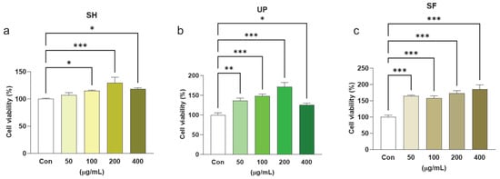 Seaweed extracts induce cell proliferation in RAW 264.7 cells. RAW 264.7 cells were exposed to 50, 100, 200, and 400 μg/mL of (a) SH, (b) UP, and (c) SF for 24 h. Cytotoxicity was observed using the CCK-8 assay. * p < 0.05, ** p < 0.01, *** p < 0.001.