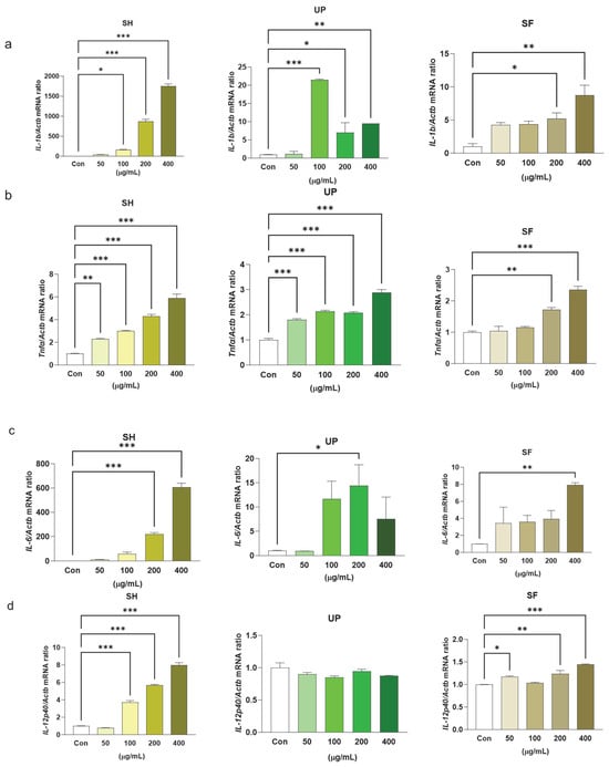 It was reported previously that macrophages are major cells of the innate immune system. When they are exposed to external stimuli such as foreign particles or pathogens, they secrete cytokines such as TNF-α, IL-1β, IL-6, and IL-12 in addition to releasing leukotrienes, chemokines, prostaglandins, and complement proteins. Together, these molecules increase vascular permeability and recruit inflammatory cells to fight infections [5]. To determine whether these seaweed extracts can induce these cytokines, RAW 264.7 cells were treated with 0, 50, 200, and 400 μg/mL of three algal extracts (SH, UP, and SF) separately for 24 h. The transcription levels of the above-mentioned cytokines were observed.