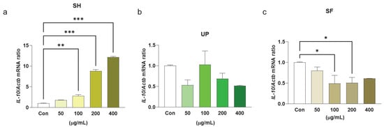 Seaweed extracts modulate transcriptional levels of anti-inflammatory cytokine IL-10 in RAW 264.7 cells. RAW 264.7 cells were exposed to 50, 100, 200, and 400 μg/mL of (a) SH, (b) UP, and (c) SF for 24 h. The transcriptional levels level of IL-10 was determined using RT-PCR. * p < 0.05, ** p < 0.01, *** p < 0.001.