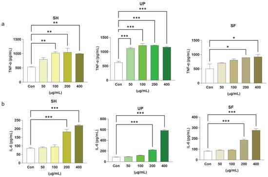 Seaweed extracts upregulate protein expression levels of pro-inflammatory markers in RAW 264.7 cells. RAW 264.7 cells were exposed to 50, 100, 200, and 400 μg/mL of SH, UP, and SF for 24 h. The protein expression levels of (a) TNF-α and (b) IL-6 were determined using RT-PCR. * p < 0.05, ** p < 0.01, *** p < 0.001.
