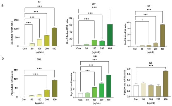 Seaweed extracts induce Nos2 and Ptgs2 mRNA expression levels in RAW 264.7 cells. RAW 264.7 cells were exposed to 50, 100, 200, and 400 μg/mL of SH, UP, and SF for 24 h. The mRNA expression levels of (a) Nos2 and (b) Ptgs2 were determined by RT-PCR. * p < 0.05, *** p < 0.001.