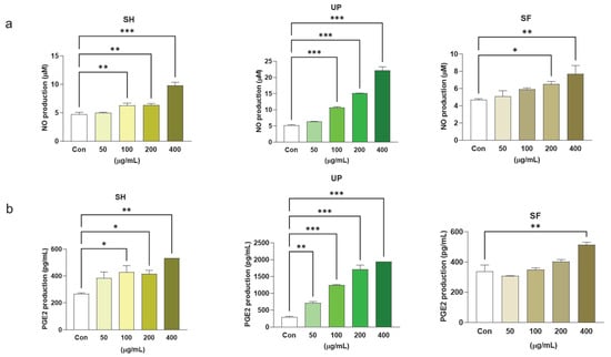 Seaweed extracts induce NO and PGE2 production in RAW 264.7 cells. RAW 264.7 cells were exposed to 50, 100, 200, and 400 μg/mL of SH, UP, and SF for 24 h. The production of (a) NO and (b) PGE2 was observed using Griess reagent assay and ELISA. * p < 0.05, ** p < 0.01, *** p < 0.001.