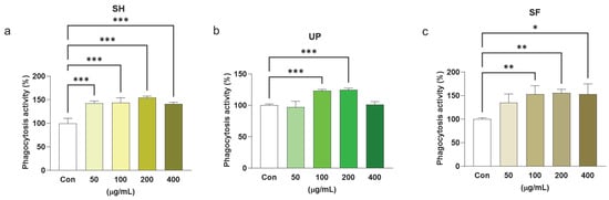 Phagocytosis is a non-specific host defense mechanism operated by macrophages as part of the innate immune response. It occurs when macrophages are exposed to external stimuli or pathogens and is marked as an important indicator of immune function [49,50]. RAW 264.7 cells were treated with different concentrations (0–400 μg/mL) of SH, UP, and SF and tested for phagocytosis activity against the control. All three extracts were found to exhibit phagocytic activity. SH showed a significant enhancement of phagocytic activity at all concentrations, UP showed significant enhancement at 100 and 200 μg/mL, and SF showed significant enhancement at 100, 200, and 400 μg/mL (Figure 7a–c).