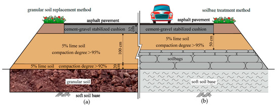 In the eastern coastal areas of China, there is a large amount of soft soil subgrade distribution. In the process of road construction, a common method for soft soil subgrade treatment is the granular soil replacement method, as shown in Figure 1a. That is, the soft soil is excavated and replaced with granular soil and stones, materials with high strength and permeability characteristics, to improve the bearing capacity of soft soil subgrade quickly. This soft soil treatment method involves the transportation and subsequent burial of the excavated residual soil, engendering myriad concerns, including land occupation, air pollution, and environmental degradation. To better comprehensively utilize the excavated soil, the soilbag-treated subgrade method has been proposed, as shown in Figure 1b. With this method, polypropylene bags are filled with the excavated soil, and the subgrade is backfilled with these soilbags for soft soil treatment.