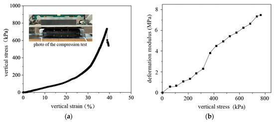 In applied engineering scenarios, it is recommended that soilbags undergo compaction using a vibrating roller. The ground pressure exerted by this roller typically ranges between 400 kPa and 600 kPa [31,32]. As illustrated in Figure 2b, the deformation modulus curve of the soilbags under unconfined compression indicates that, following rolling, the deformation modulus of the soilbags can reach up to 6.5 MPa. This value is comparable to the modulus typically observed in hard plastic clay. From the data of the unconfined tests, it can be inferred that the compression strength and deformation modulus of soilbags filled with clayey soil meet the criteria required for subgrade construction materials.