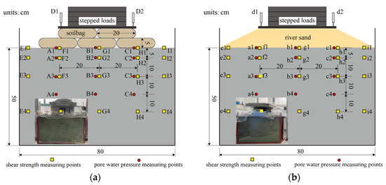 Schematic view of the consolidation tests on soft soil subgrades: (a) treated with soilbags and (b) treated with sand cushion.