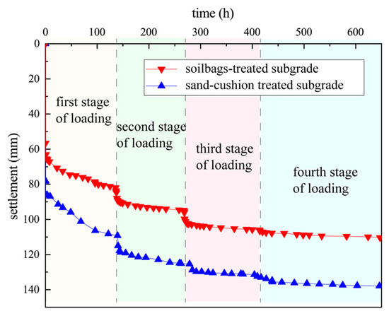Figure 4 shows the surface settlement over time of the model testing subgrades. From the data presented, it can be observed that the surface settlement of the soilbag-treated subgrade increased to 81.94 mm after stabilization under the first-stage load. With the application of the second-, third-, and fourth-stage loads, increments of 13.34 mm, 10.65 mm, and 4.37 mm in settlement were recorded, respectively. As a result, a final measured settlement of up to 110.35 mm was noted. For the subgrade treated with the sand cushion, the settlements recorded after stabilization under the first-, second-, third-, and the fourth-stage loads were 109.39 mm, 122.86 mm, 130.05 mm, and 137.86 mm, respectively, which were greater than those of the soilbag-treated subgrade under corresponding loads. Such differences in settlement are attributed to the staggered arrangement of the soilbags in the upper and lower layers, which have the effect of spreading the stresses, enabling the vertical stresses from the upper layers to be more uniformly distributed to the base [33]. From these observations, it is inferred that the soilbag-treated subgrade exhibited a superior bearing capacity compared to the sand cushion-treated subgrade.