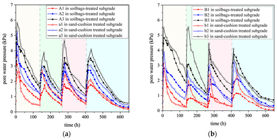 In Figure 5, the pore water pressure in the subgrades treated with soilbags and the sand cushion is depicted, measured at both the center and at 20 cm from the center, at depths of 0, 5 mm, and 15 mm, respectively. For both the sand cushion-treated and soilbag-treated soft soil subgrades, a sudden increase in the pore water pressure was witnessed once the vertical load was applied, reaching a maximum value, followed by a gradual decrease due to the dissipation of pore water. The pore water pressure in the subgrade treated with the sand cushion was found to dissipate faster than that treated with the soilbags due to the superior drainage effect of the sand compared to the soilbags. Nevertheless, under the subsequent second- to fourth-stage loads, a decline in the drainage capacity of the sand cushion layer occurred. This was caused by the compression of the sand particles into the underlying soft soil subgrade due to their minuscule size. The mix of soft soil and sand reduced the permeability ability of the sand cushion. Conversely, the soilbags, being resistant to compression into the underlying soft soil subgrade, mainly depended on the drainage through the contact interface and the gaps between the soilbags. Thus, their drainage capacity was generally unaffected by the vertical load. Consequently, under subsequent second- to the fourth-stage loads, a faster dissipation of the pore water pressure in the soilbag-treated subgrade was observed.