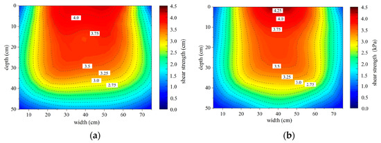 Undrained vane shear strength at depths of (a) soilbag-treated subgrade and (b) sand cushion-treated subgrade.