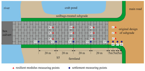 The performance of the subgrades was facilitated by observing both the resilient modulus and the surface settlement. A schematic for the measurements is presented in Figure 8, which includes twelve designated locations for the measurement of the resilient modulus, marked as R1–R9 in the soilbag-treated subgrade and as r1–r3 in the original design of the subgrade, accompanied by eight predefined points for monitoring the surface settlement, identified as S1–S5 and s6–s8.