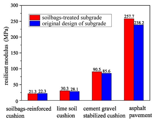 Figure 9 presents the resilient modulus of the soilbag-treated subgrade and the original design of the subgrade calculated from the detected deflection of the PFWD tests. The resilient modulus was averaged from the R1–R9 measuring points in the soilbag-treated subgrade and the r1–r3 measuring points in the original design of the subgrade, respectively. It is obvious that the resilient modulus of each layer in the soilbag-treated subgrade was either equal to or slightly higher than that of the comprised subgrade. This means that the reinforcement of the excavated clayey-soil soilbags achieved almost the same bearing compacity as the granular soil replacement-treated subgrade in the original design of the subgrade.