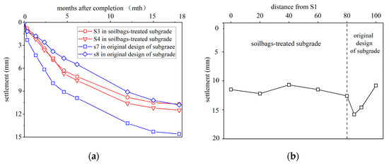 Figure 10 illustrates the surface settlement evolution of the soilbag-treated subgrade and the original design. As shown in Figure 10a, the surface settlement evolution was similar in both treatments of the soft soil subgrades; however, the settlement measured at point s7 in the original design of the subgrade was larger than that measured at S3 and S4 in the soilbag-treated subgrade and at s8 in the original design of the subgrade. Moreover, it is obvious from Figure 10b that the settlement along the soilbag-treated subgrade was relatively close, while the differential settlement along the original design of the subgrade was much larger. This indicates that after 18 months of operation, the soilbag reinforcement reduced the uneven settlement along the road.
