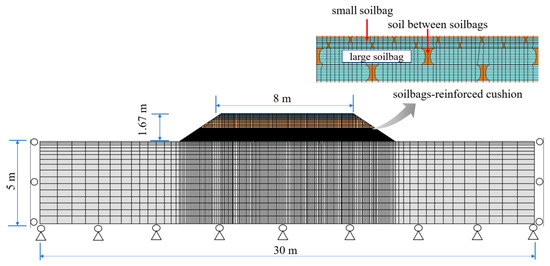 Mesh and boundary conditions of soilbag-treated subgrade FEM model.