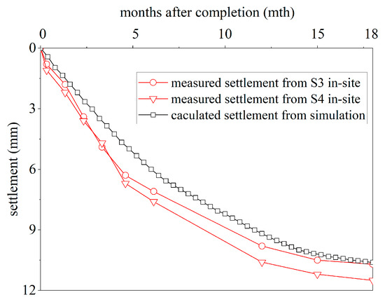The surface settlements were monitored after the completion of the asphalt pavement. Settlement monitoring lasted for eighteen months. In the first six months, the settlement monitoring interval was one month, and after that, the interval was three to six months.
