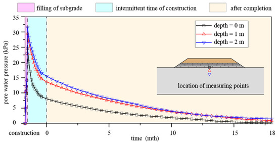 where u is the excess pore pressure, is the mean normal stress equal to , is the variation of pore water pressure with time, is the Laplace operator, and is the coefficient of consolidation. In the FEM consolidation analysis, the deformation and pore water pressure changed with time at each point of the subgrade model. By solving the equilibrium equation and continuity equation using the finite differences method, Biot’s governing equation in the FEM simulation was obtained as: