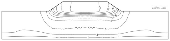 Figure 13 illustrates the dissipation of the pore water pressure at various depths during and up to 18 months following the completion of the soft soil subgrade construction. It was observed that an increase in the pore water pressure occurred rapidly with the filling of the subgrade during construction. Subsequently, a swift decrease in the pore water pressure was noted in the month after construction, with the reduction reaching up to 40% at a depth of 2 m. This trend continued with a gradual decline in the pore water pressure, culminating in an essential dissipation at 18 months post-construction. In Figure 14, the settlement distribution across different positions of the subgrade treated with soilbags is depicted after 18 months post-construction. The central area of the subgrade surface experienced the most significant settlement, recorded at 11.96 mm. Uniformity was characteristic of the settlement distribution at comparable depths along the subgrade, with no abrupt variations detected. This uniformity is attributed to the alternating layout of the soilbags, which enhanced the structural integrity of the subgrade.