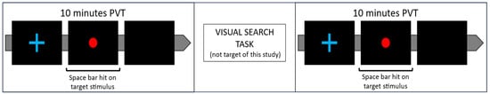 Graphical representation of stimuli presented to participants and the flow of the protocol proposed, consisting of two separate psychomotor vigilance tasks (PVT) and a visual search task in between. Resting periods have been considered at the end of each task to avoid visual strain. The PVT required the participants to press the space bar as fast as possible after the onset of a red dot which appears on the screen after a blue fixation cross.