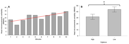 (A) Head micromovement variability increase over time during PVT; (B) Head micromovement variability increase in low-vigilance condition. * denotes p < 0.05. Red lines indicate significant data trends.