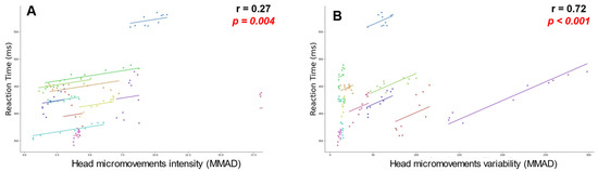 Repeated measures scatterplots (subject data in different colors). (A) Correlation between Reaction Times and head micromovements intensity; (B) Correlation between Reaction Times and head micromovements variability. All correlations are significant with p < 0.05, highlighted in red in the figure.