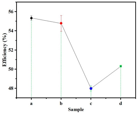 Process efficiency (%) of ZS-ZnO-NPs synthesis using different zinc salts and a plant extract of Phoenix dactylifera L. at pH 12: (a). ZnCl2, (b). ZnSO4·H2O, (c). Zn(CH3COO)2·2H2O, and (d). Zn(NO3)2·6H2O.