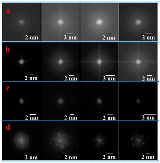 FFT illustrating the distinct crystalline structures of ZS-ZnO-NPs synthesized using different zinc salts and a plant extract of Phoenix dactylifera L. at pH 12: (a). ZnCl2, (b). ZnSO4·H2O, (c). Zn(CH3COO)2·2H2O, and (d). Zn(NO3)2·6H2O.