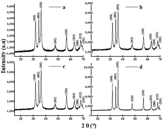 The diffraction peaks observed in all samples at 2θ (°) = 31.85, 34.46, 36.30, 47.59, 56.67, 62.89, 66.57, 68.1, and 69.10 were attributed to the crystallographic reflection’s planes (100), (002), (101), (102), (110), (103), (200), (112), and (201), which corresponded to the characteristic peaks of the hexagonal wurtzite structure of ZnO (JCPDS n°.01-079-2205) [68], confirming the successful synthesis of ZS-ZnO-NPs. The peak intensity and position exhibited variations depending on the type of zinc salt employed, particularly at the most intense peak (101) for each ZnO-NPs spectrum. ZS-ZnO-NPs synthesized with ZnCl2 demonstrated superior crystallinity, showing a degree of crystallinity of 28.1% in Figure 6a. In comparison, ZnSO4·H2O, Zn(CH3COO)2·2H2O, and Zn(NO3)2·6H2O resulted in lower crystallinities at the same peak, with values of 27.6% (Figure 6b), 27.1% (Figure 6c), and 14.8% (Figure 6d), respectively. The variation in peak intensities is likely attributed to differences in zinc ion concentrations and the nature of anions in the various zinc salts, impacting the growth and nucleation of ZS-ZnO-NPs [63,69,70]. This observation aligns with studies on the prolongation of oxidation time, where a similar effect in peak intensity and corresponding crystallinity was noted. This phenomenon was explained by the preferential growth of ZnO nanostructures along the c-axis as wet oxidation progressed from 2 to 8 h [71,72]. When varying the anion, the application of the Hofmeister series can offer insights, as discussed in Section 3.3.