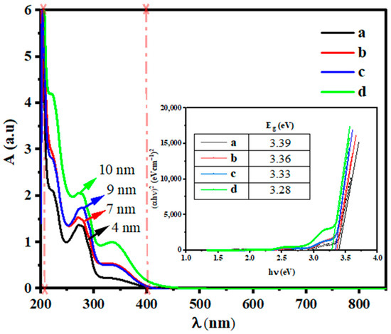The UV-visible absorption spectra were utilized to confirm the formation of ZS-ZnO-NPs and determine their gap energies by using a UV-spectrophotometer (Varian Cary 6000i, Santa Clara, CA, USA). This type of analysis provides an indirect measurement of absorbance and enables the calculation of the optical gap energy (Eg, eV) of the samples [26]. The Eg was figured out by Tauc’s relation α = (B(hv − Eg)n)/hv, where α represents the dimensionless absorption coefficient computed from the absorbance A, α = (2.3023·A cm−1). The transition nature depends on the value of n, which takes 2 and ½ for indirect and direct allowed transition, respectively, and 3 and 3/2 for indirect and direct forbidden transition, respectively. Additionally, h, v, and B are Planck’s constant, the frequency, and a material-dependent constant whose dimensions depend on the value of n (B = 1), respectively [47].
