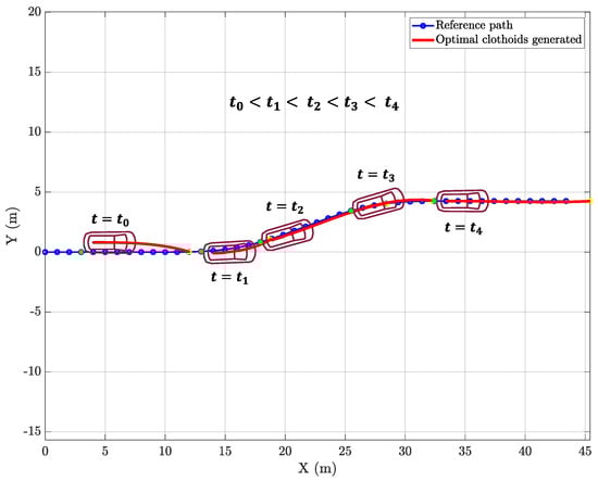 Figure 1 graphically depicts the controller’s operation, showing vehicle positions over time and the corresponding clothoids generated by the controller. It is evident that as the cross-track error diminishes, the constructed clothoid increasingly aligns with the intended reference path.