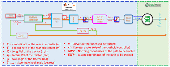 This study employs a co-simulation framework, integrating TruckSim® (2017 edition) and Simulink® (Release 2022a) to create a simulated environment. Figure 2 illustrates the communication pathways for the closed-loop lateral control implemented within Simulink®. As indicated in the block diagram, the kinematic quantities exported from TruckSim® closely align with real-world data obtained through GPS, rather than abstract state variables. It is important to note that, in this implementation, the complete reference path coordinates or waypoints are available in advance. The following steps summarize the working of the implemented clothoid controller: