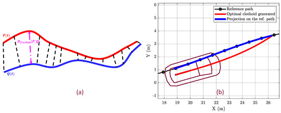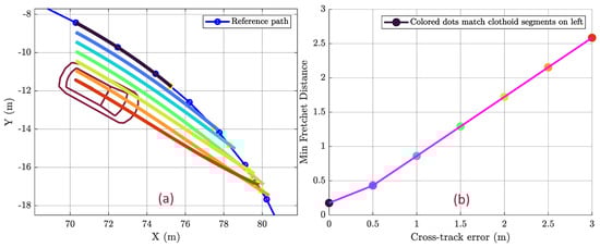 (a) Pictorial representation of deviation between the locally fitted clothoid and the reference path. (b) Minimum Fréchet distance vs. initial cross-track error.