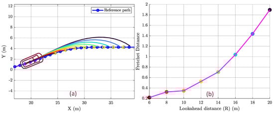 In such waypoint navigation control systems, lookahead distance determines how a vehicle anticipates and tracks its desired path. Lookahead distance represents the distance ahead of the vehicle along its current trajectory at which specific target points or waypoints are placed. The selection of an appropriate lookahead distance is a critical decision as it influences the vehicle’s behavior [38,39,40]. A major novelty of the current work over the previously devised method is the development of a more robust and mathematically sensible way of evaluating this lookahead distance for the most commonly used heuristic approach as discussed in [3,10].