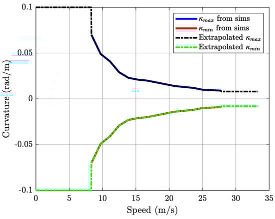 To discover these saturation limits, a sequence of step-steer tests was conducted at varying velocities, each involving distinct step-steering angle inputs. The saturation limits were established based on the curvature values corresponding to the steering angle input at which the vehicle experienced a rollover. The outcomes of this series of simulation tests, presented in Figure 6, confirm the expected trend of decreasing curvature limits as the vehicle’s speed increases.
