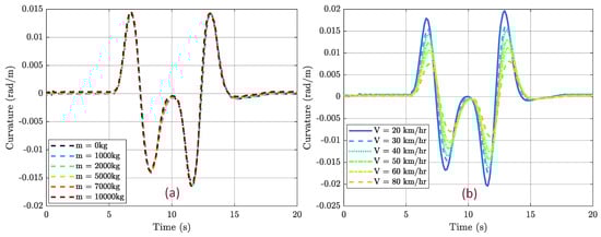 Variation of curvature w.r.t, (a) payload mass, (b) vehicle speed for the same steering profile input.
