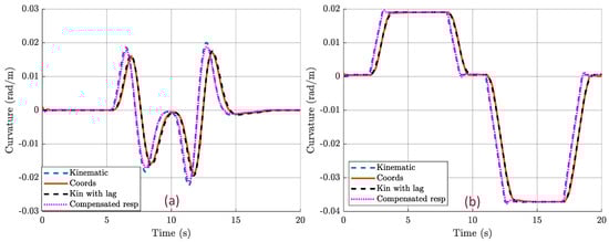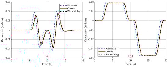 Figure 9 illustrates the time–domain validation of the lead filter’s lag compensation capabilities. Figure 9a,b depicts the compensated response for a dual lane change (DLC) as well as the step input steering maneuvers, respectively, as previously depicted in Figure 8. To delve into more detail, the kinematic relationship that links the steering wheel angle (input to TruckSim®) to curvature, essentially represents a normalized input. The curvature derived from the vehicle’s coordinates signifies the actual curvature of the path followed by the vehicle’s rear axle center. The ‘Kinematic with lag’ plot portrays the outcome of the estimated lag (Equation (5)) coupled with the kinematic model (which maps the steering wheel angle to curvature, as mentioned above, ). As demonstrated, this plot closely aligns with the actual curvature plot (derived from the path coordinates), which was its intended function.