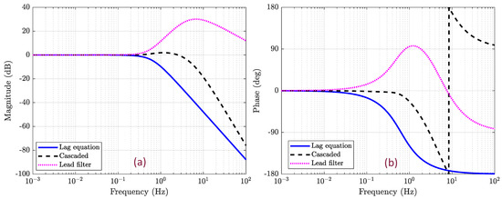 Figure 10 shows the characteristics of the compensator (lead filter) dynamics, the original plant dynamics (estimated lag transfer function), as well as the cascaded dynamics. The increase in the total bandwidth of the system and the reduction in the phase lag in the desired frequency of interest can be inferred from Figure 10a and Figure 10b, respectively.