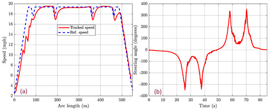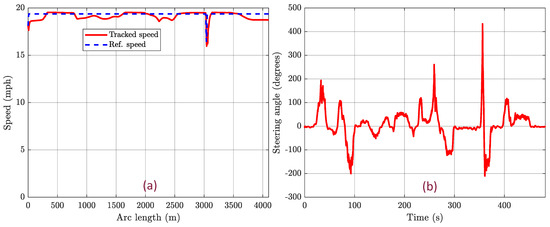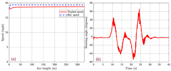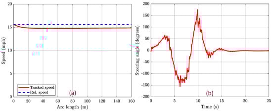 (a) Tracked speed vs. arc length. (b) Steering angle vs. time plot for the tracked trajectory.