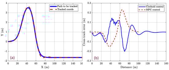 The analysis reveals that the proposed clothoid-based lateral controller is closely competitive with the existing MPC-based lateral controller in terms of path-tracking accuracy as shown in Figure 17. It can be seen that the clothoid controller slightly delays in converging the error to zero when compared to the MPC approach. This observation may be ascribed to the differential testing conditions; the MPC controller was calibrated using a car model in CARSIM, which likely presents a less-complex steering trajectory than that required for a semi-tractor trailer. Nevertheless, the clothoid controller demonstrates a comparable level of tracking accuracy, as shown in Figure 17b.