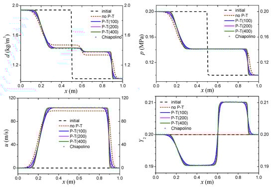 Figure 1 displays the density, pressure, velocity, and vapor mass fraction distribution at time t = 1 ms. The dashed lines represent the initial conditions. The short-dashed lines represent the solutions without phase transition (no P-T), and the thick lines represent the present relaxation algorithm (P-T) with different cells. Due to the consideration of the phase transition in water, the transition from liquid phase to vapor phase occurs near the right shock wave front, resulting in an increase in the mass fraction of the gas phase and a decrease in the mass fraction of the liquid phase. As a result of the phase transition, the shock wave speed and temperature on the right side decreased. The current numerical results show good agreement with Chiapolino’s results.