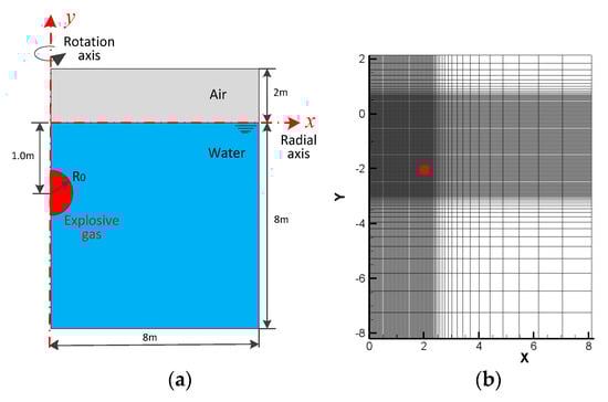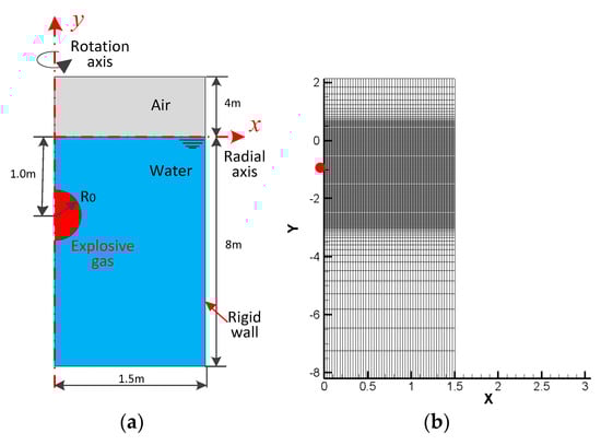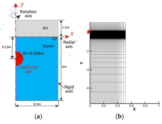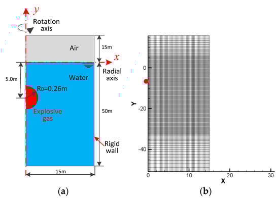 Figure 2 illustrates the simulation setup without a rigid wall and showcases the mesh strategy employed. A non-uniform mesh scheme was utilized to enhance the computational efficiency, with the computational domain extending from (0, 7) m to (−7, 2) m. The initial radius of the charge, denoted as R0, was set to 0.009 m. The computational domain included a uniform zone (with a mesh size of Δx = Δy = R0/10) measuring 40R0 × 80R0, which facilitated the modeling of the motion of the explosion bubble. The symmetric axis (y-axis) was assigned an impenetrable boundary condition, while non-reflecting boundary conditions were applied to the surrounding boundaries. Figure 3 presents the simulation setup with a rigid wall and outlines the corresponding mesh strategy. In this case, a rigid wall was positioned at the right boundary. The initial conditions for both simulation cases were considered as follows: