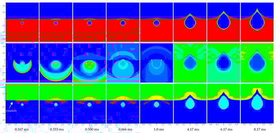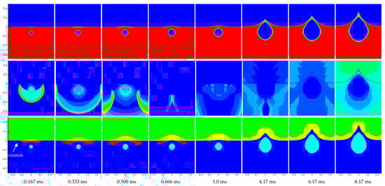Numerical results of density (top), pressure (middle), and cavitation domain (bottom) under the condition of an underwater explosion near the free surface without a rigid wall at t = 0.8, 1.2, 1.6, 2.0, 2.6, 3.0, 4.0, and 6.0 ms (from left to right). The red area represents the cavitation domain in the bottom contour plots.